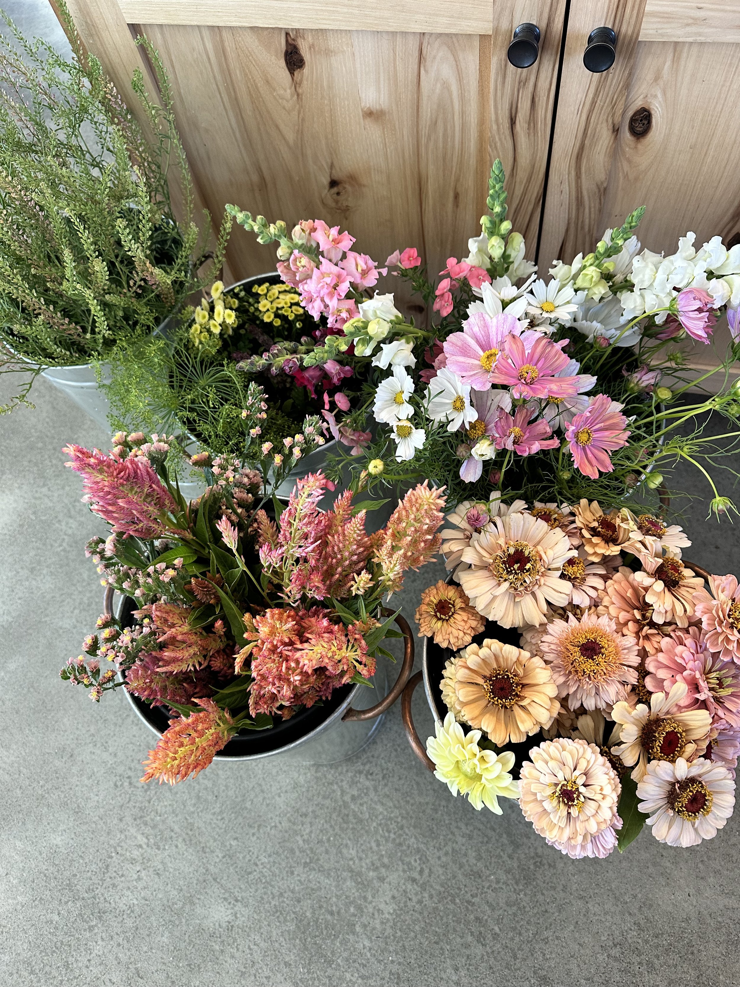 Seasonal flower buckets and bouquet bars for weddings, showers, and celebrations offered throughout Northern California